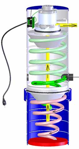 Once the dirt is deposited into the bottom canister, the cyclonically filtered working air then passes through the motor fans where it is vented to the outside.